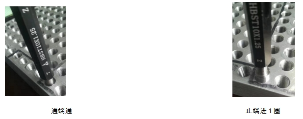 使用鋼絲螺套專用螺紋塞規(guī)(俗稱:底孔塞規(guī)),對攻絲完成的安裝鋼絲螺套用內(nèi)螺紋進行檢測。通端通,止端至多進2圈,表示底孔合格。