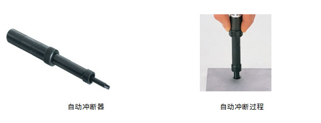 當鋼絲螺套安裝完成時,將自動沖斷器沖頭端插入已裝有鋼絲螺套的內(nèi)螺紋孔中,用手握住自動沖斷器的施力部分,向下施加軸向力,當聽到“咔嚓”的聲音時,表示鋼絲螺套的安裝柄已被沖斷,見下圖。